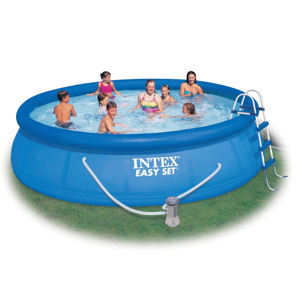 Надувной бассейн Интекс, модель Easy Set (Изи Сет). Диаметр бассейна: 457 см. Высота бассейна: 107 см. Объем бассейна: 12431 л. Вес: 42 кг. Производительность насоса: 3785 л/ч. Надувной бассейн Intex Easy Set Pool с непрозрачными стенками. Бассейн легко и быстро устанавливается без применения технических средств. Процесс сборки бассейна до наполнения водой занимает 15 минут. Технология SUPER-TOUGH дает стенкам бассейна тройную прочность. Стенки сделаны из трех отдельных слоев: два слоя плотного винила и один - внешний - полиэстр для особой прочности. Борта бассейна поддерживаются надувным кольцом, которое, по мере заполнения бассейна, поднимается вместе с уровнем воды, расправляя стенки. Фильтр обеспечивает очистку воды и редкую ее замену (1 раз в месяц). Удобный сливной клапан присоединяется к садовому шлангу. Таким образом, воду можно слить в любое удобное место или, например, полить сад. Не нуждается в подготовке грунта, насыпке песка и т.п. Комплект поставки: Надувной бассейн Intex Easy Set Pool 28166, 457х107 см. Насос-фильтр 220В для рециркуляции воды. Лестница. Тент для бассейна. Подстилка под бассейн. Руководство по эксплуатации. DVD-диск с инструкцией по установке.